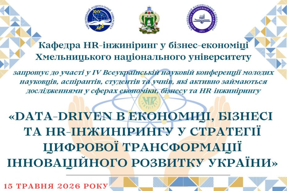 «DATA-DRIVEN В ЕКОНОМІЦІ, БІЗНЕСІ ТА HR-ІНЖИНІРИНГУ У СТРАТЕГІЇ ЦИФРОВОЇ ТРАНСФОРМАЦІЇ ІННОВАЦІЙНОГО РОЗВИТКУ УКРАЇНИ» 15 травня 2026 року Запрошуємо до участі у ІV Всеукраїнській науковій конференції… Читати далі »IV ВСЕУКРАЇНСЬКА НАУКОВА КОНФЕРЕНЦІЯ ЗДОБУВАЧІВ ОСВІТИ ТА МОЛОДІ