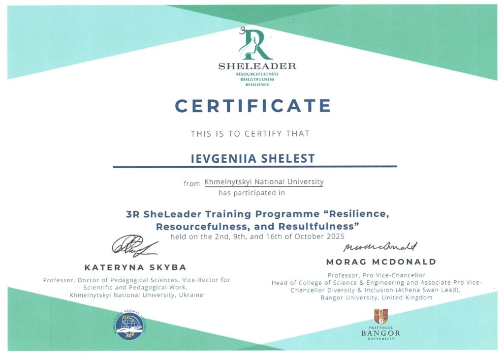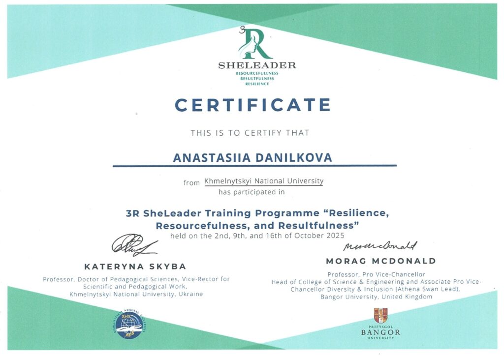 Представниці кафедри HR-інжинірингу у бізнес-економіці Хмельницького національного університету успішно завершили міжнародну програму «3R SheLeader: Резильєнтність, Ресурсність, Результативність» та сьогодні отримали сертифікати за участь у серії тренінгів, реалізованих спільно з Бангорським університетом (Уельс, Велика Британія) за підтримки British Council.