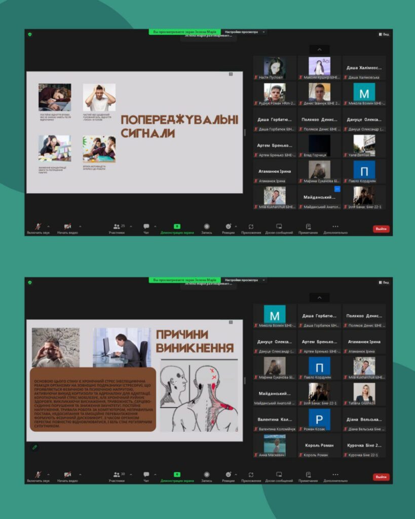 Окремий блок було присвячено ключовим причинам стану — тривалому стресу, статичному та цифровому перевантаженню, гібридним форматам роботи й порушенню work-life balance, що знижують нейрокогнітивну ефективність і спричиняють decision fatigue. Показано вплив на увагу, пам’ять і прийняття рішень, підкреслено, що навіть помірний біль знижує академічну та професійну результативність і якість мислення.