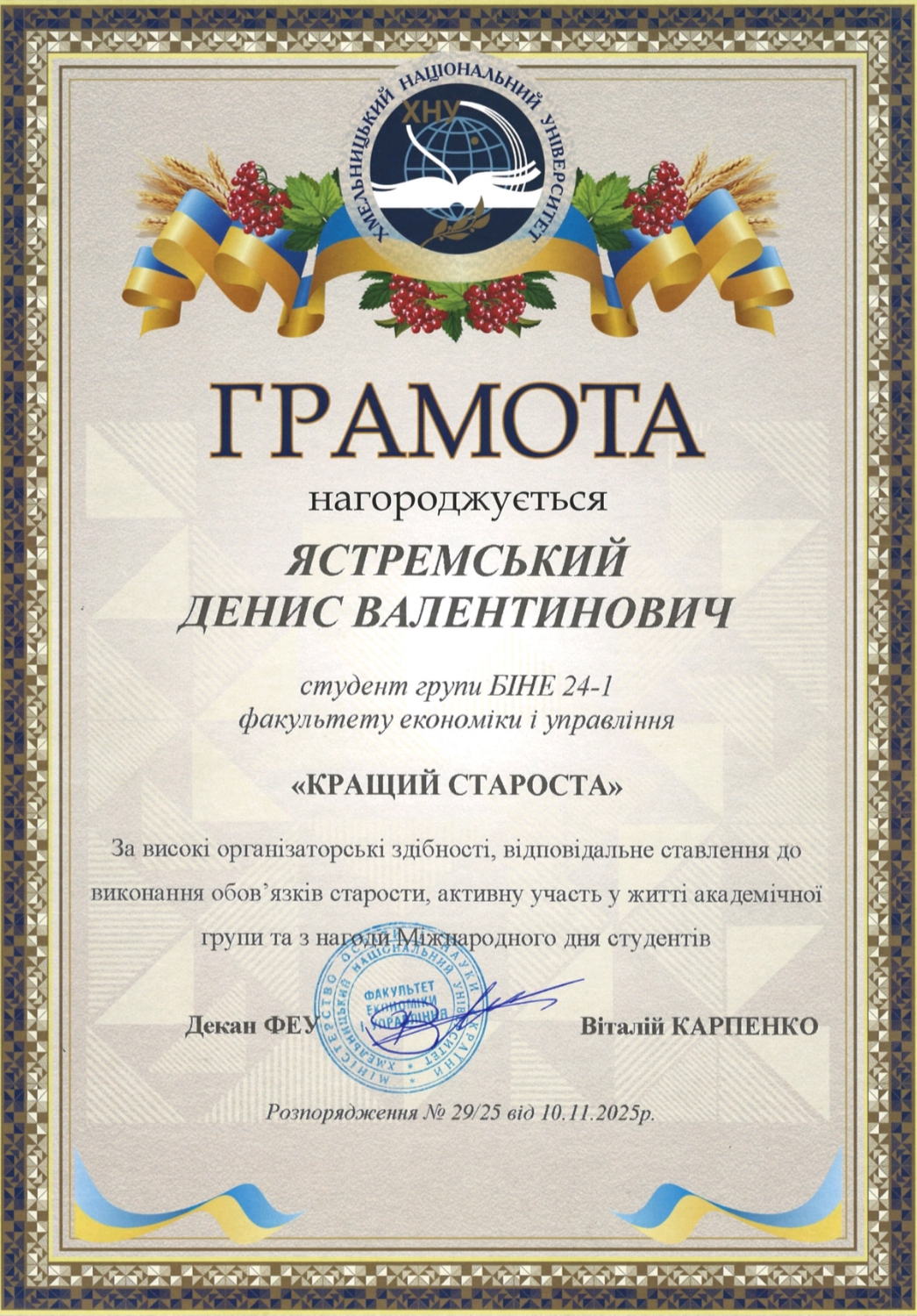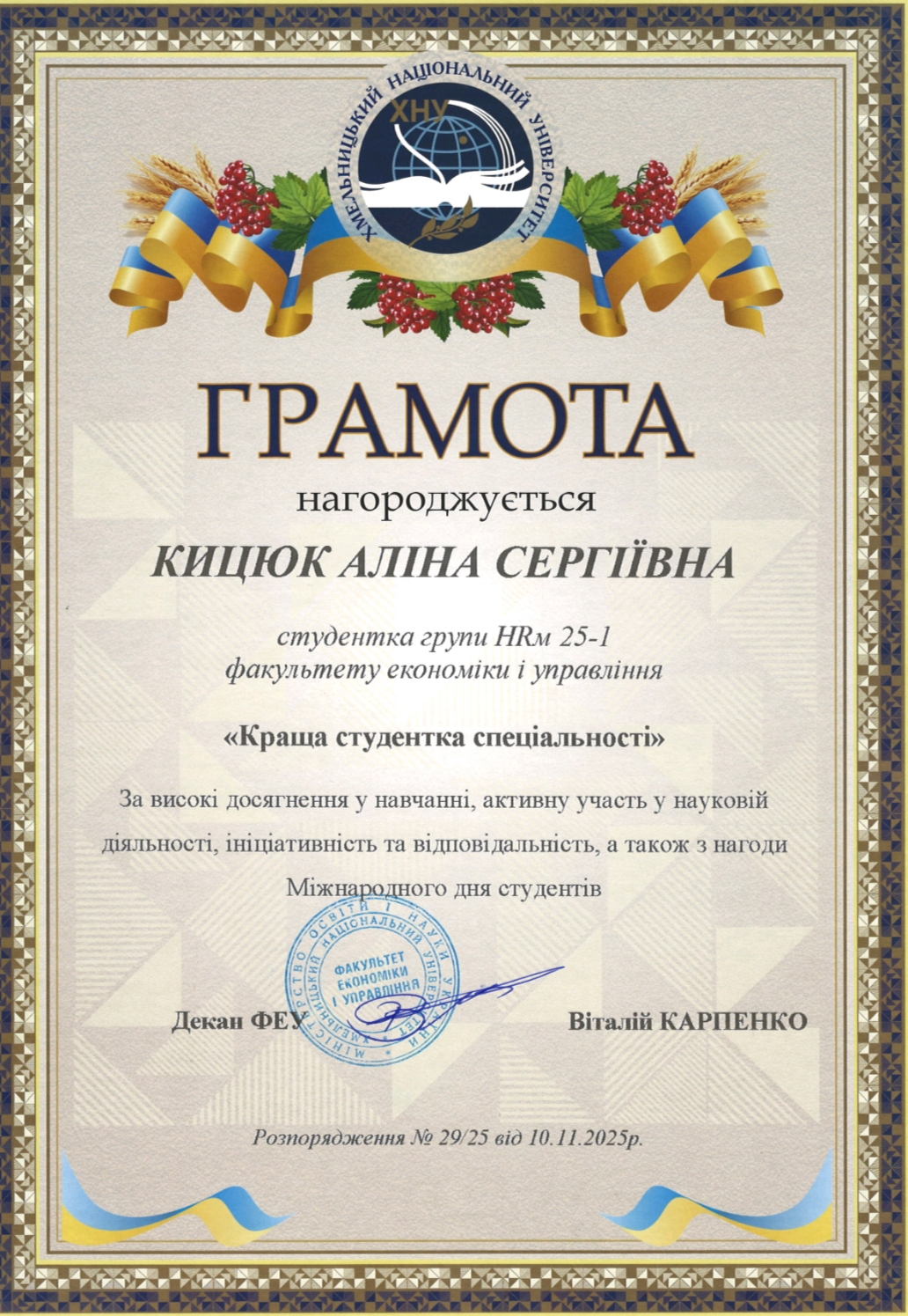 Грамотами факультету економіки і управління нагороджено: