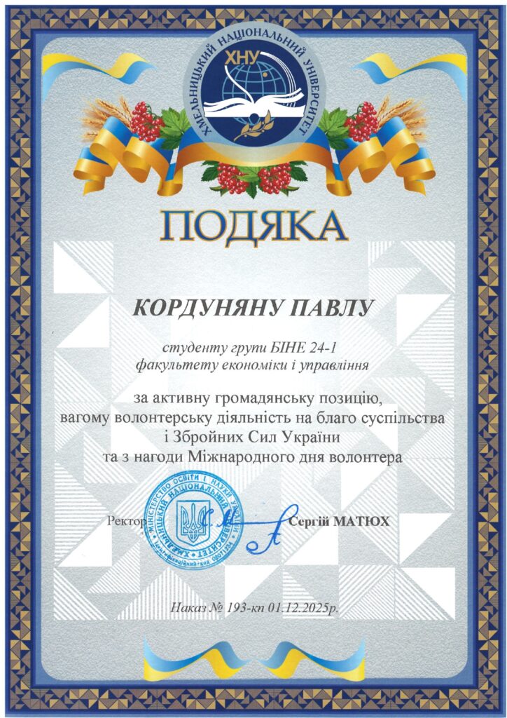 - Кордунян Павло Олександрович, студент групи БІНЕ 24-1, ОПП «HR-інжиніринг у бізнес-економіці»;