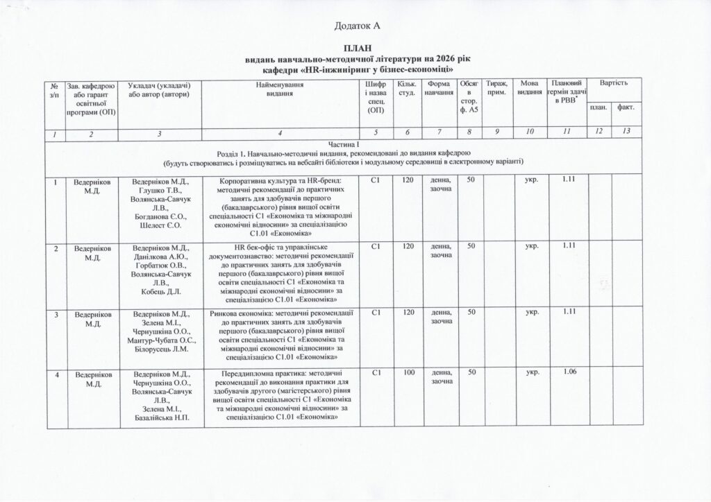 видань навчально-методичної літератури кафедри HR-інжиніринг у бізнес-економіці