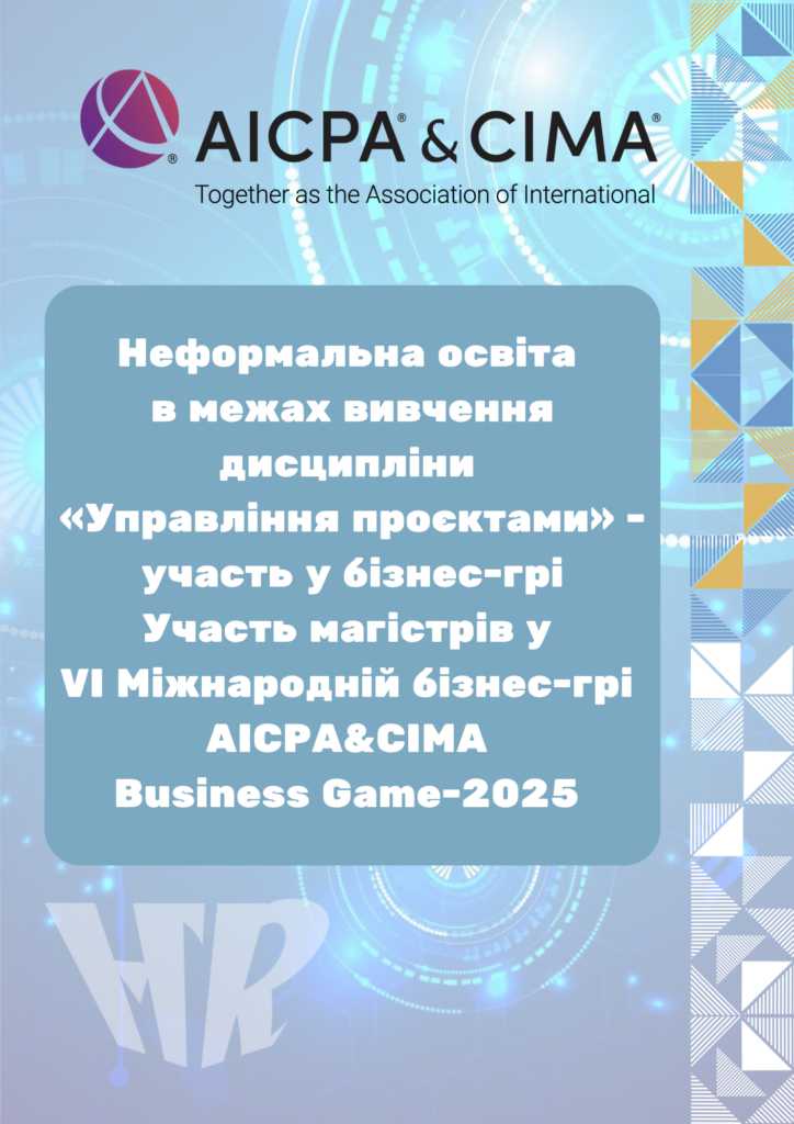 Залучення здобувачів до участі у AICPA & CIMA Business Game 2025 є ефективним інструментом інтеграції елементів неформальної освіти в освітній процес, що сприяє формуванню професійних компетентностей у сфері проєктного менеджменту, розвитку аналітичного мислення, навичок командної роботи та прийняття управлінських рішень в умовах невизначеності.
