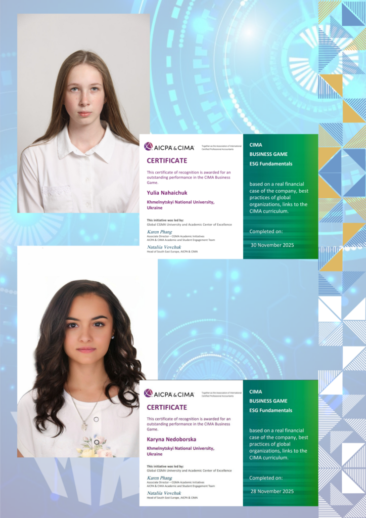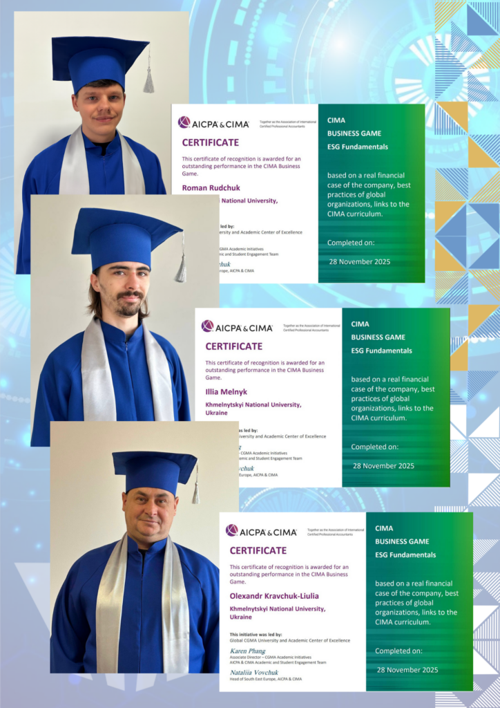 Вітаємо здобувачів другого (магістерського) рівня вищої освіти ОПП «HR-інжиніринг в економіці» з успішною участю у VІ Міжнародній бізнес-грі AICPA & CIMA Business Game 2025, організованій міжнародною професійною асоціацією AICPA & CIMA, яка завершилася 30 листопада 2025 року.