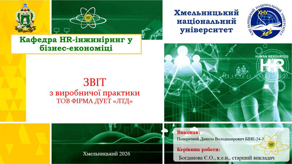 Виробнича практика — це важливий етап навчання, де студенти мають можливість застосувати теоретичні знання з економіки у реальних ринкових умовах. Цьогорічні звіти продемонстрували високий рівень підготовки, аналітичне мислення та креативний підхід до розв’язання актуальних завдань HR-сфери.